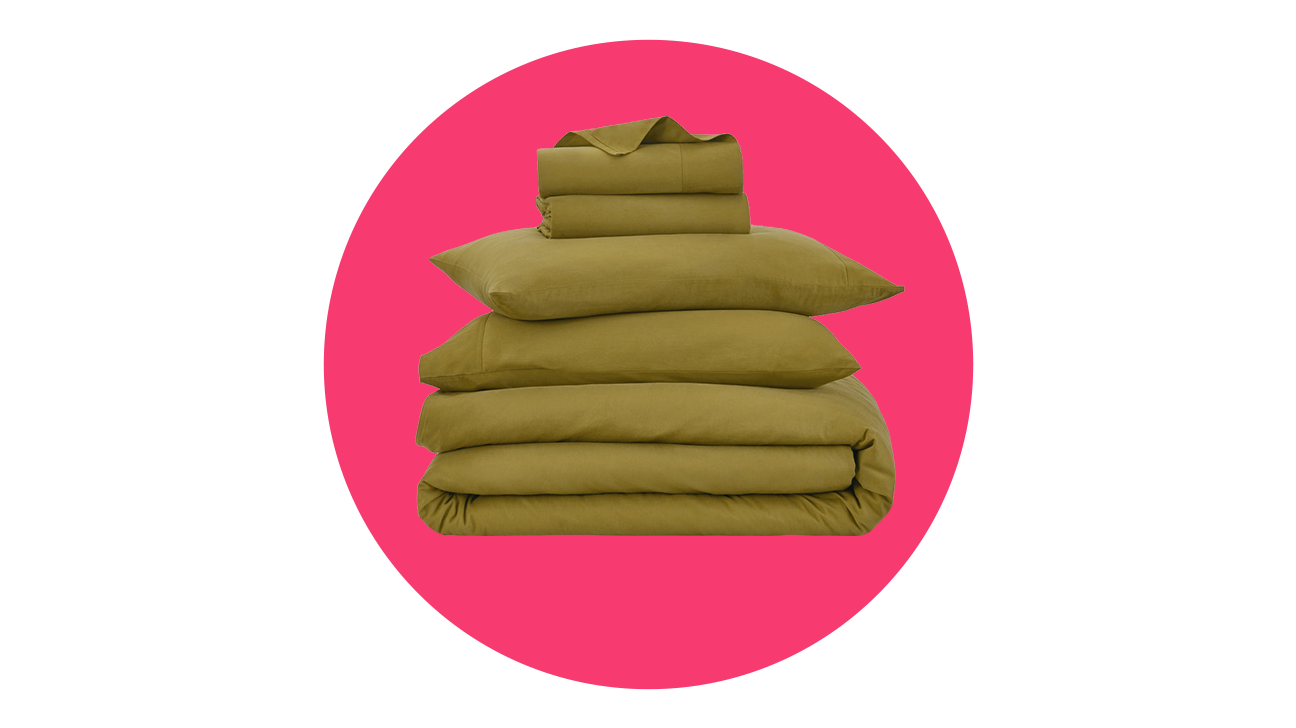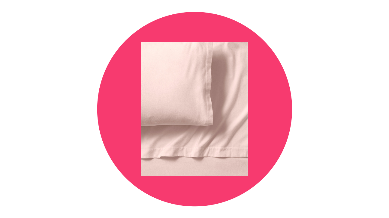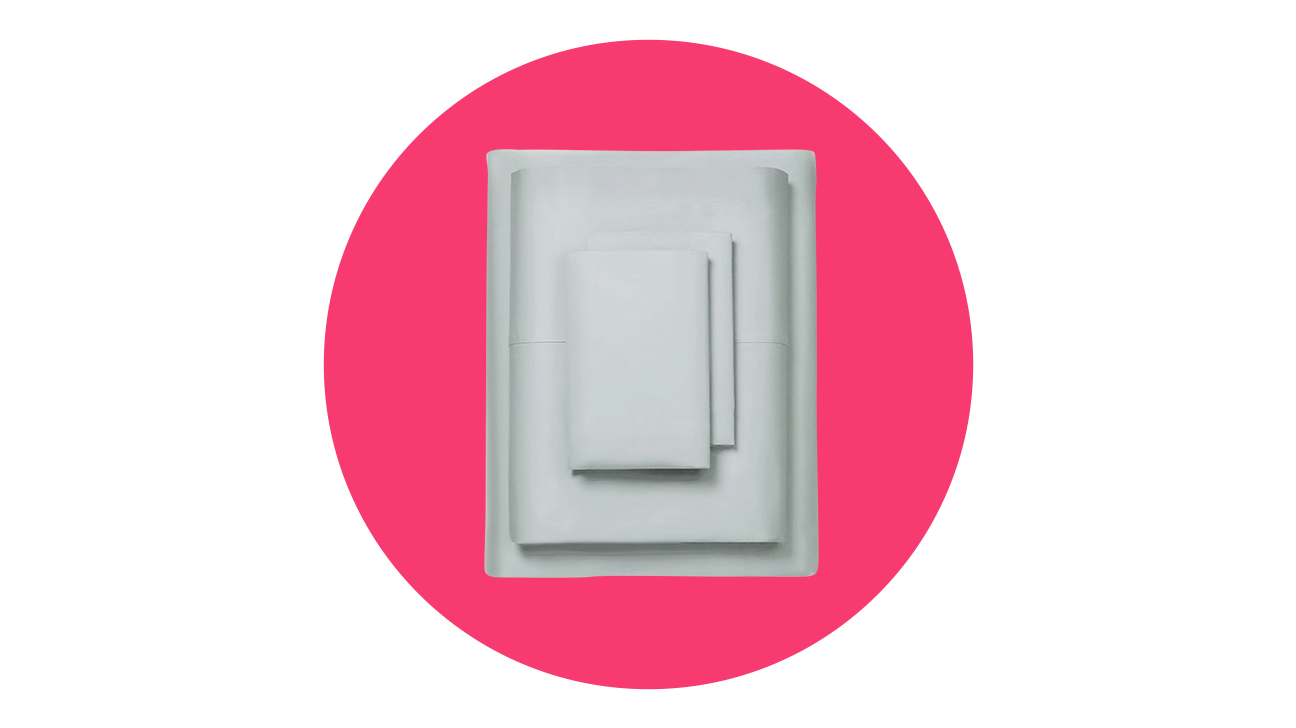 This set includes a fitted sheet, a flat sheet, and two standard pillowcases and is available in a variety of neutral colors and patterns. The sheets are made of 100 percent cotton that’s double-napped for extra softness and are easy to clean (just pop ’em in the wash!).