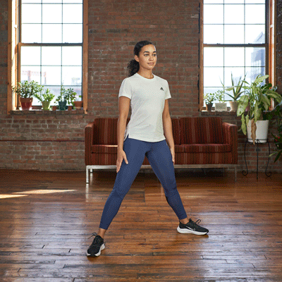 This thigh-busting move targets your quads, hamstrings, glutes, hip abductors, core, abs, and lower back. It also gets your hips, knees, ankles, and connective tissues working.